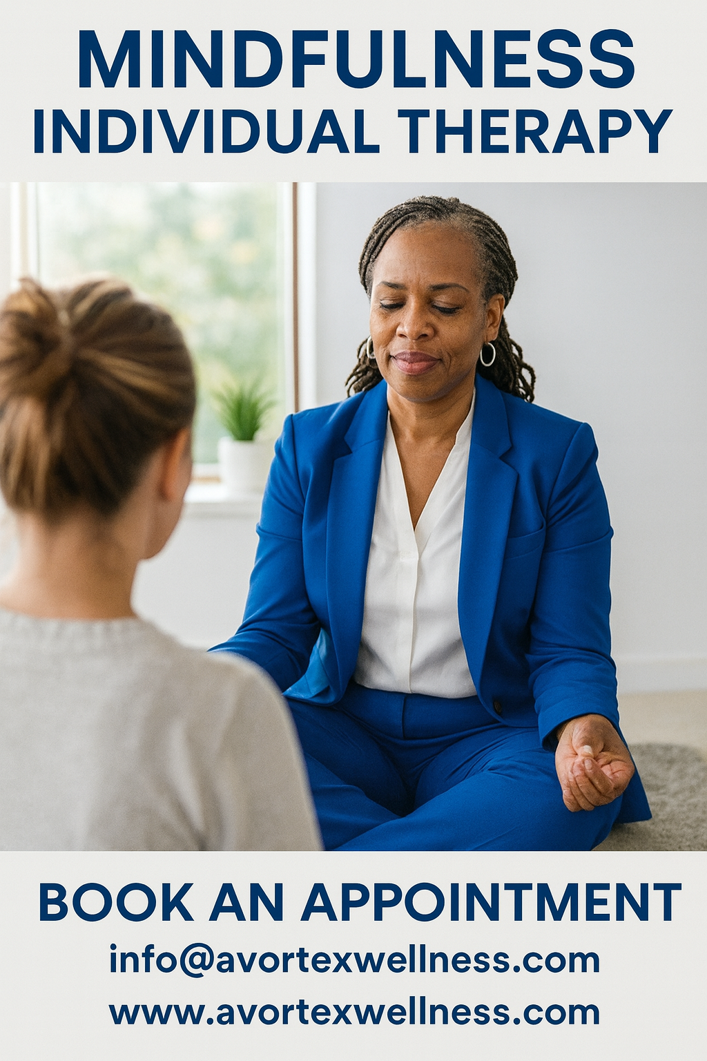 At Avortex Wellness Group, our mindfulness-based individual therapy sessions are designed to help you gently return to yourself—one breath, one moment at a time.