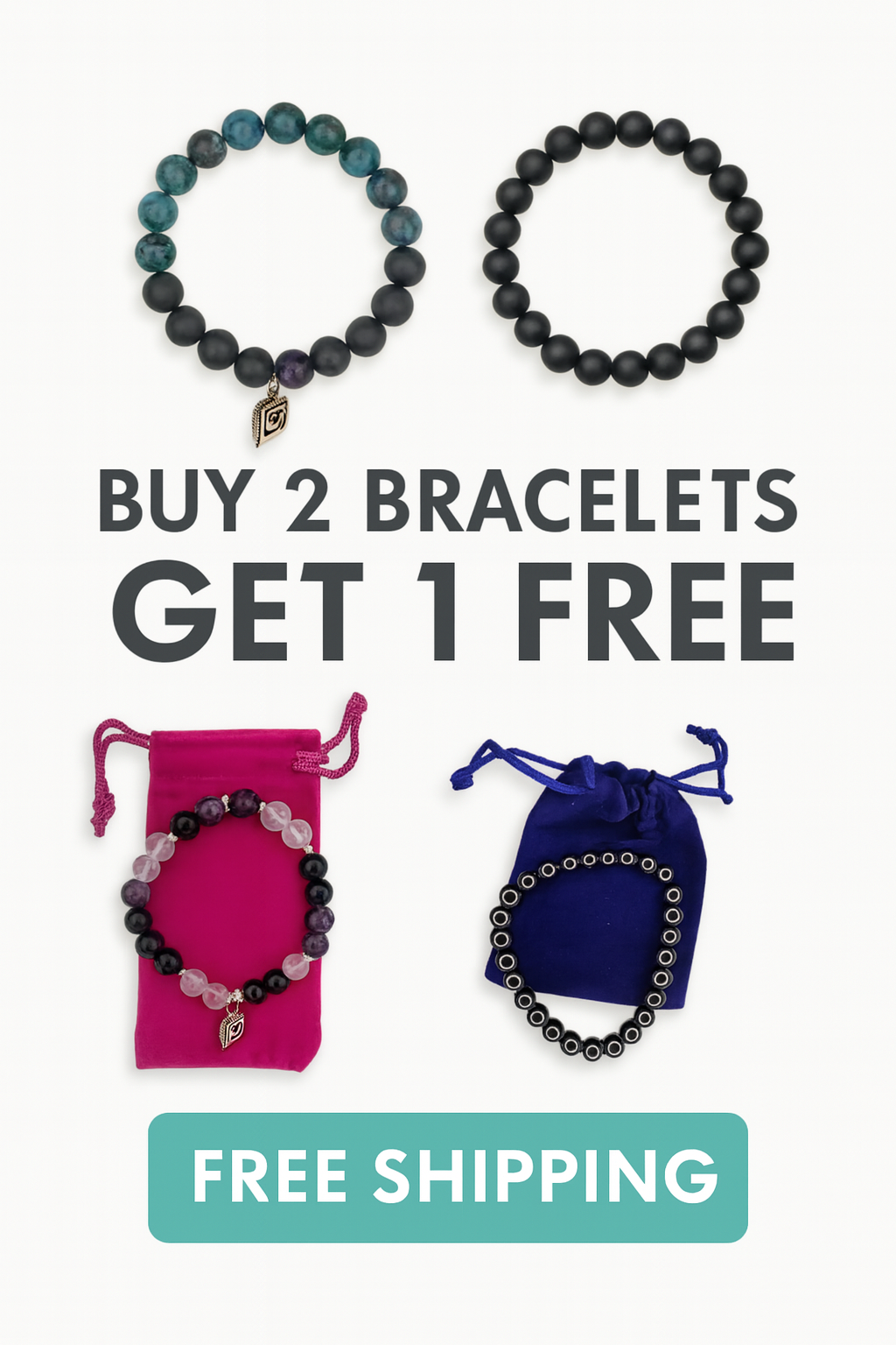 All bracelets are handcrafted using real, genuine gemstones chosen for their energetic properties, durability, and natural beauty. Materials may include Hematite, Black Onyx, Tourmaline, Quartz, Evil Eye charms, and high‑quality spacers depending on the design.