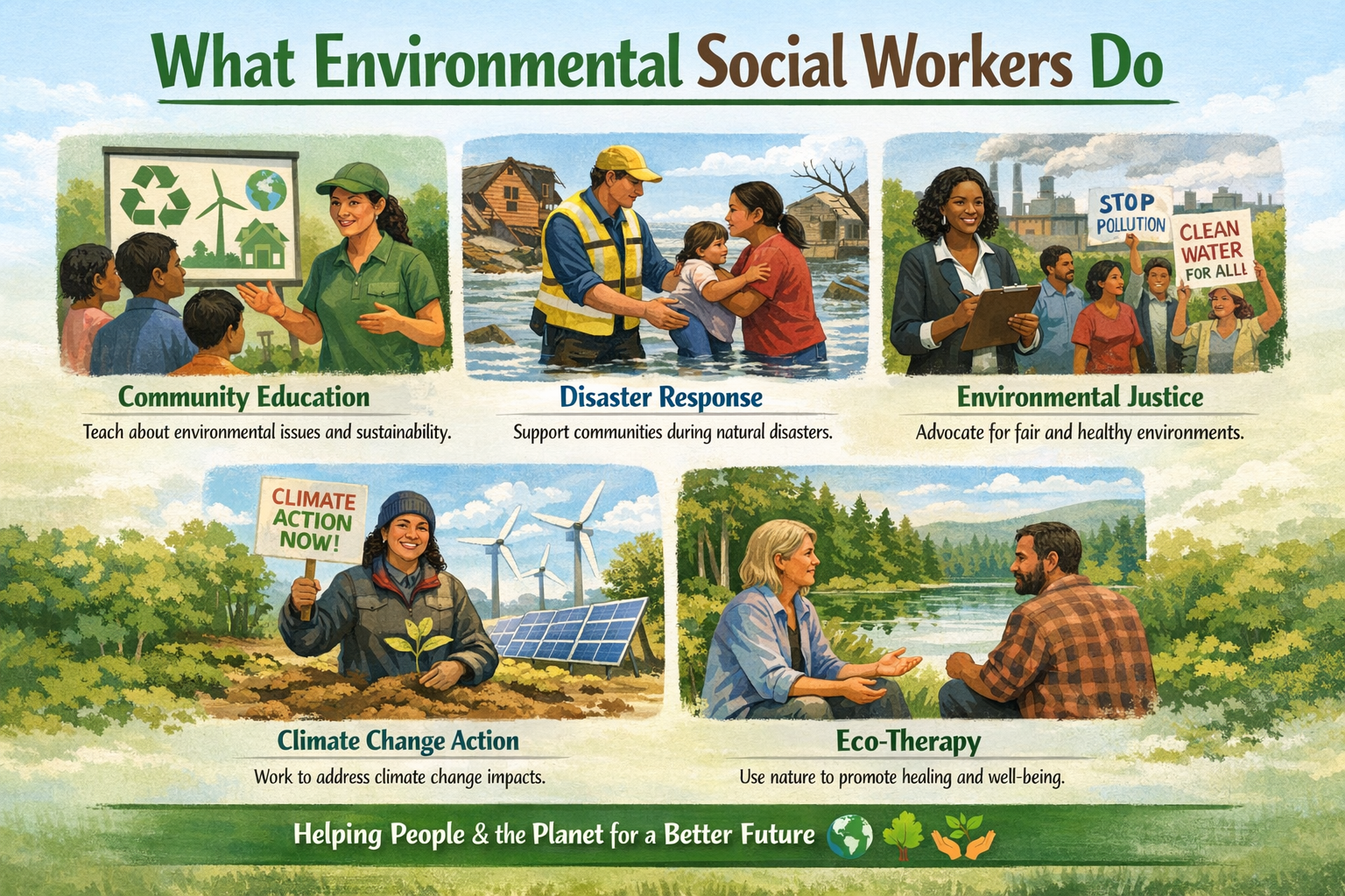 In practice, Environmental Social Workers may help families maintain safe living conditions, support older adults aging in place, respond to environmental crises, or advocate for fair access to clean air, water, and housing. They blend empathy with practical action—assessing environmental needs, reducing hazards, and strengthening community stability. This approach honors dignity, promotes wellness, and ensures that every person has the right to live in an environment that supports their physical, emotional, and social health.